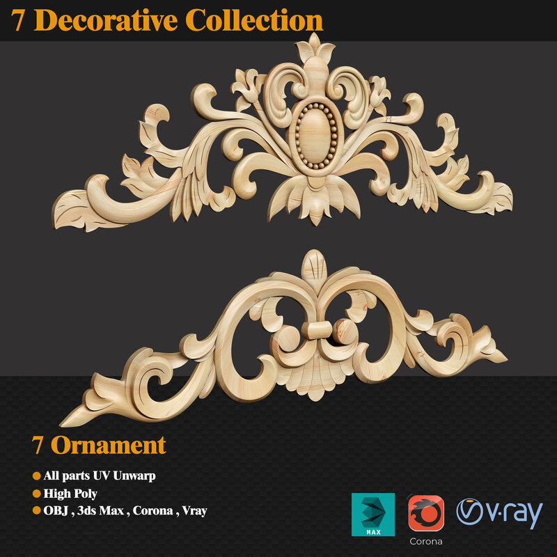 This file contains four ornaments with high polygons. You can use this product in the interior decoration of classic scenes. This product is in the category of classic products. I tried to do this model with the utmost care and elegance. All objects are uv unwraped and you can use another texture on them without any hassle. You can even apply that color. This product can also be used on classic objects. Including objects such as: dresser, classic chair, classic bed, classic wardrobe and ...... I have modeled them with 3D Max. Can be used for both Corona and Vray rendering engines. There is also OBJ file in this product. You can apply the Turbo Smooth command if you need objects to have better quality. Of course, I have tried to manage the number of players so that your scene does not take up too much RAM on your system. I hope you enjoy this and support me. Thanks