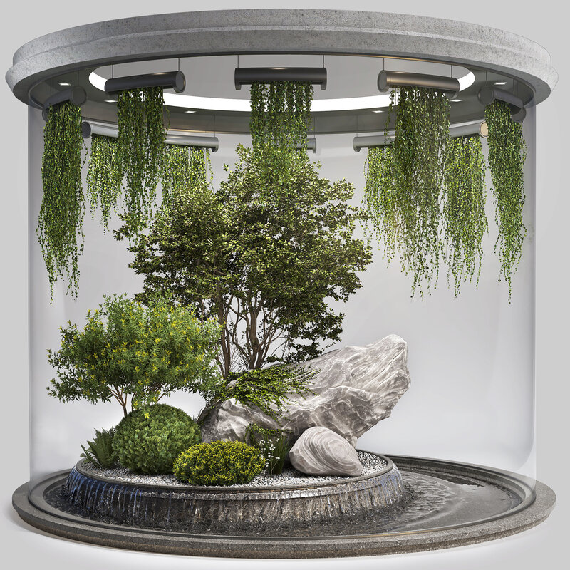 The indoor garden surrounded by glass contains: Waterfalls and Plants, Bushes, gravel, trees, and Hanged ivy. In the archive: 3ds max 2018 file (Corona) 3ds max 2018 file (Vray)